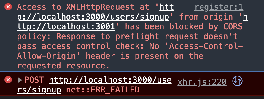 "Access to XMLHttpRequest at 'http://localhost:3000/users/signup' from origin 'http://localhost:3001' has been blocked by CORS policy: Response to preflight request doesn't pass access control check: No 'Access-Control-Allow-Origin' header is present on the requested resource."